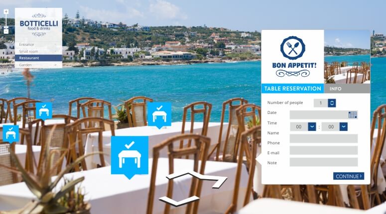 Grâce à la fonction de réservation Tourmake, vous pouvez facilement réserver par la visite virtuelle de l'activité, un service offert par une activité commerciale spécialisée ou une table dans votre restaurant.